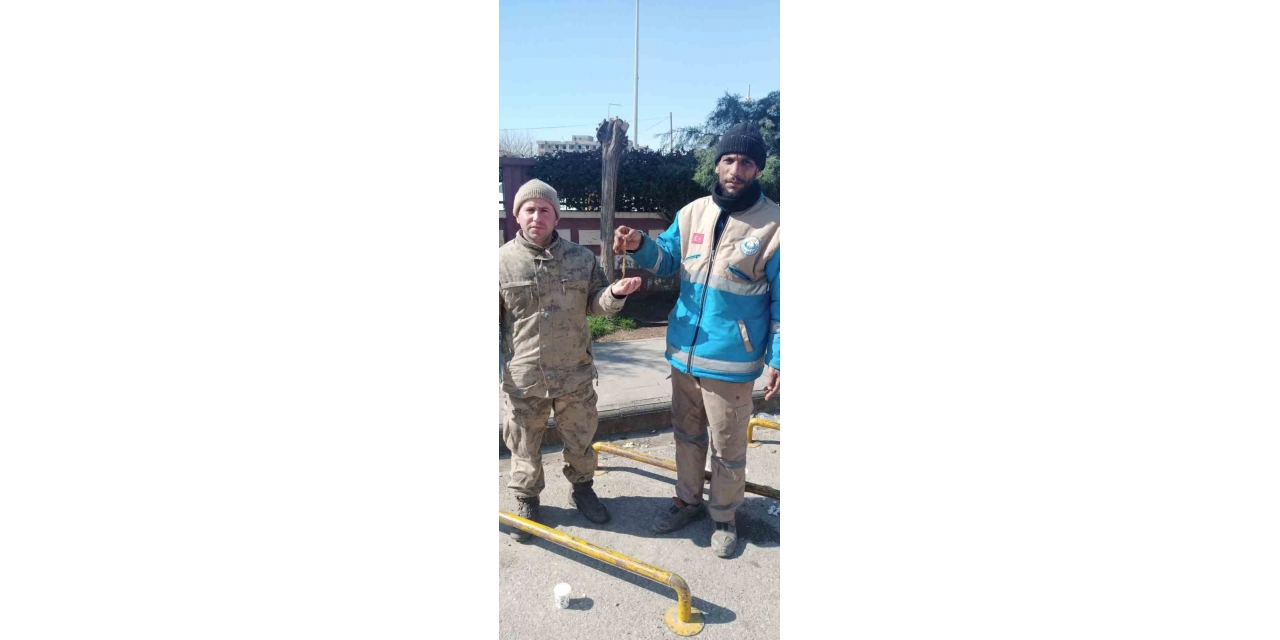 Haliliye Belediyesi, depremden ağır şekilde etkilenen Adıyaman'da temizlik desteğini sürdürürken, görevli personel Mehmet Aslan, bulduğu altın kolyeyi görevli askerlere teslim etti.