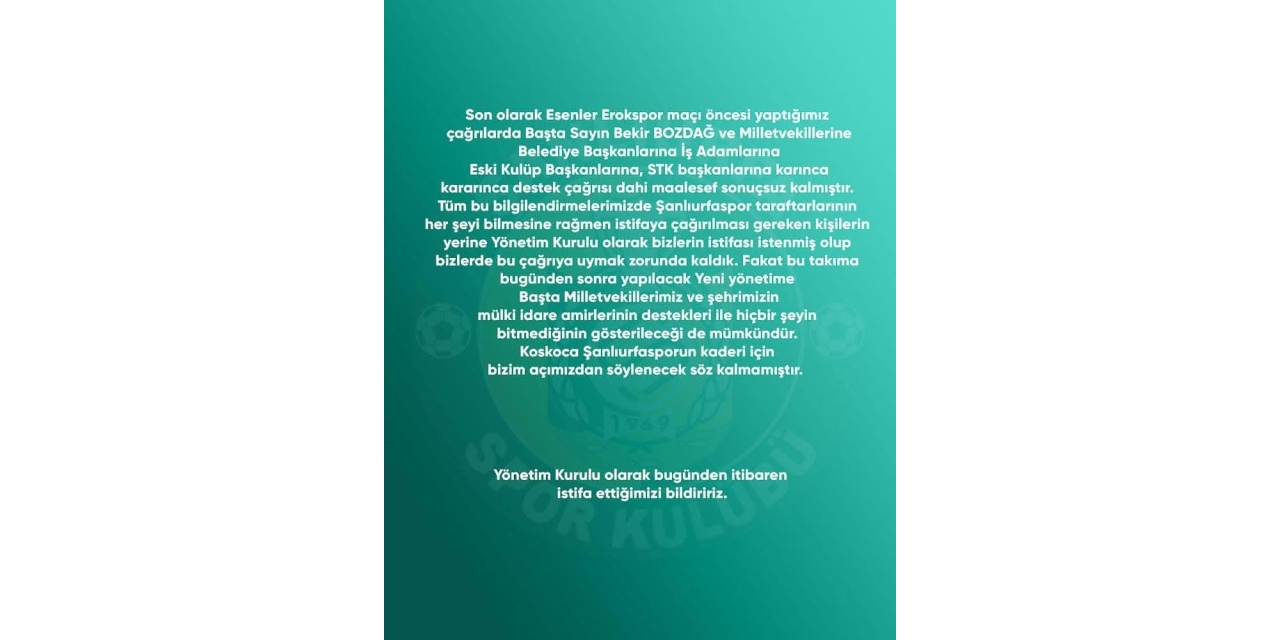 Koskoca Şanlıurfaspor için bizim açımızdan söylenecek söz kalmamıştır. Yönetim kurulu olarak bugünden itibaren istifa ettiğimizi bildiririz" ifadelerine yer verildi.