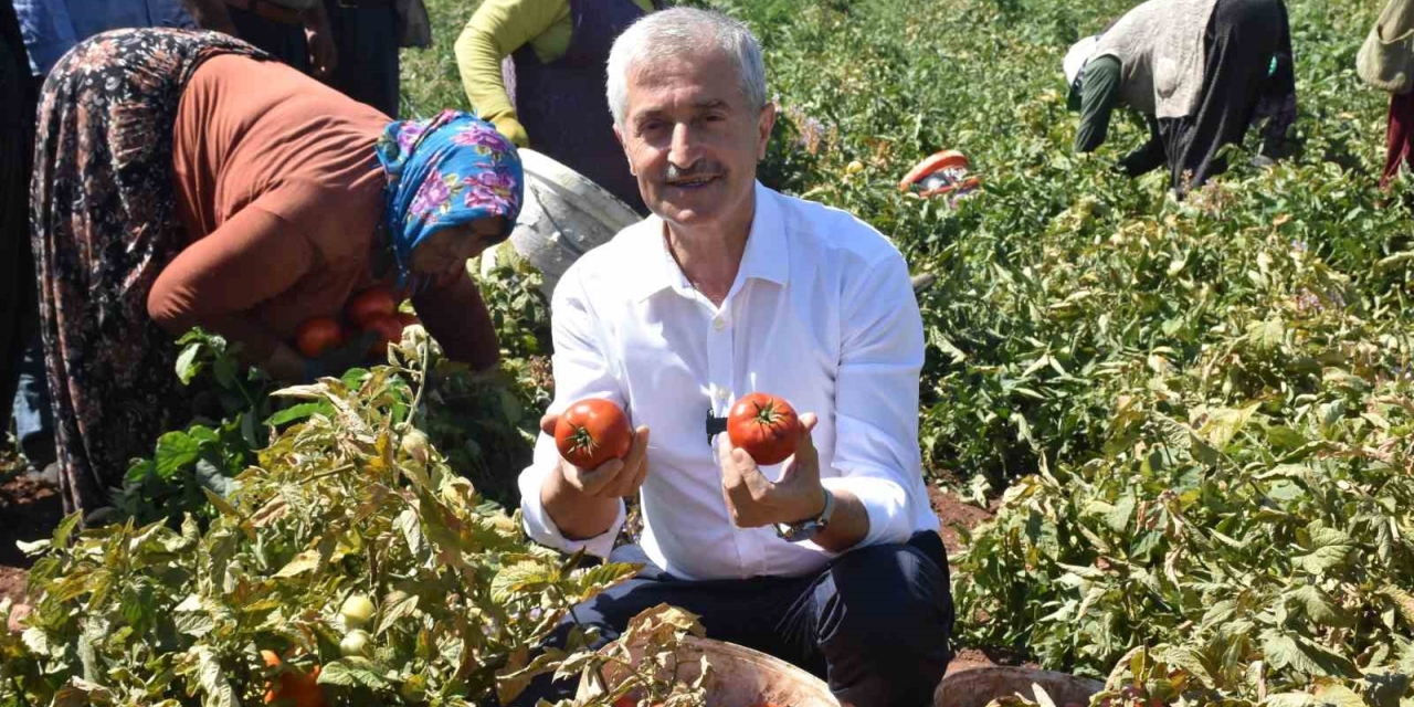 Çiftçilere toplam 43 milyon 500 bin adet domates, biber, salatalık, patlıcan ve kavun fidesi dağıtan Başkan Mehmet Tahmazoğlu, çiftçiler ile birlikte domates toplayıp, sohbet etti.